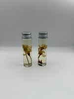 (1) Wet specimen containing: 2 cherry (Prunus cerasus) blossoms in isopropyl alcohol. Stored in a 20ml glass vial with an aluminum screw-on lid.