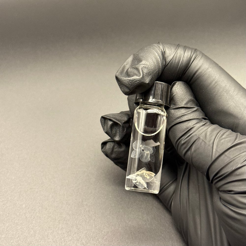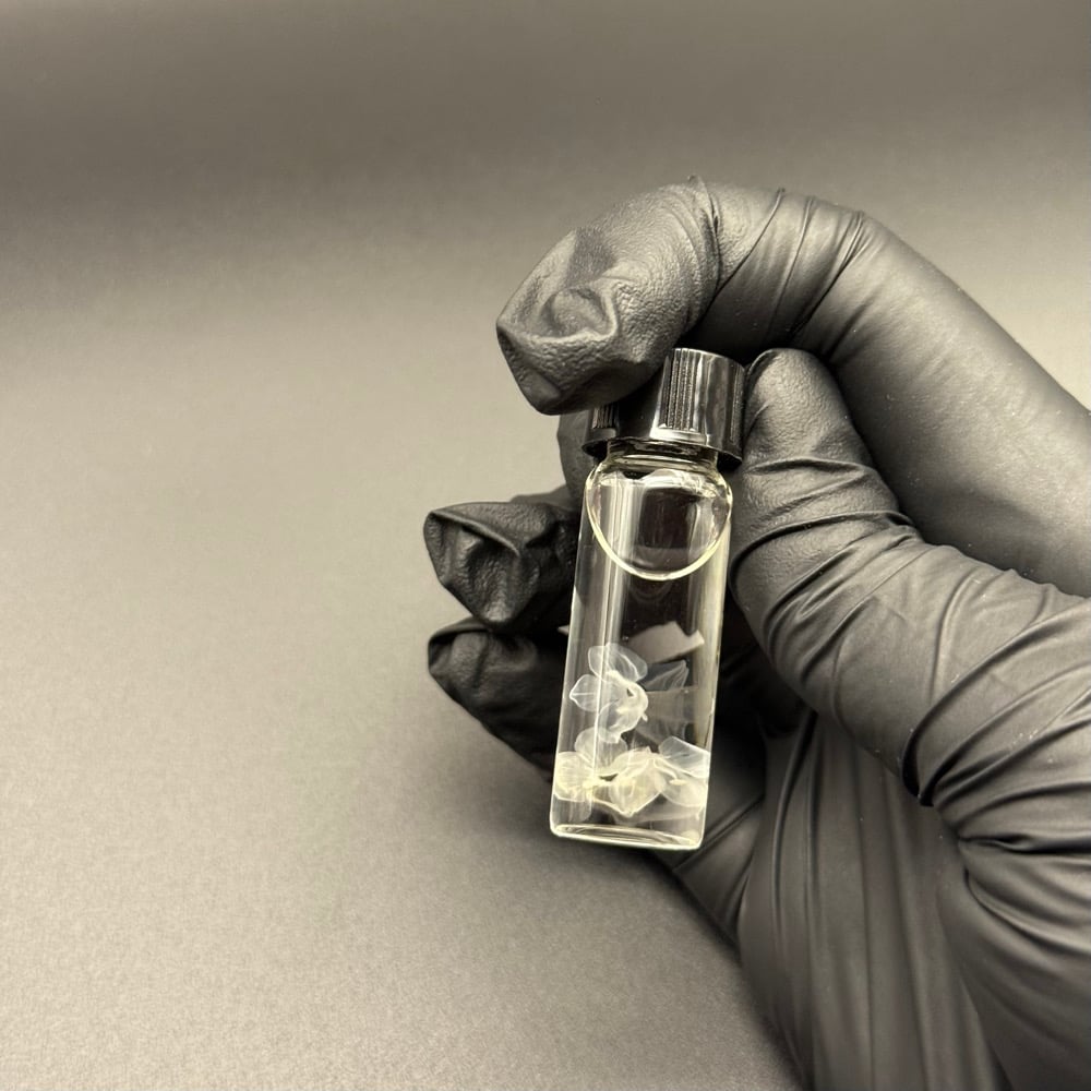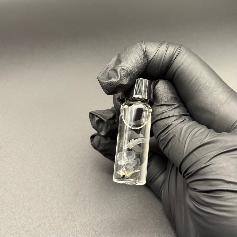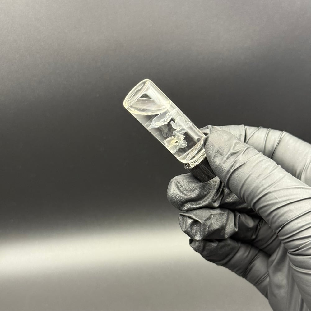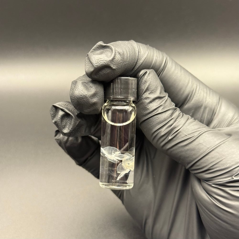 (1) Wet specimen containing: 3 speedwell (Veronica persica) flowers in isopropyl alcohol. Stored in a 4ml glass vial with a black plastic screw-on lid.
