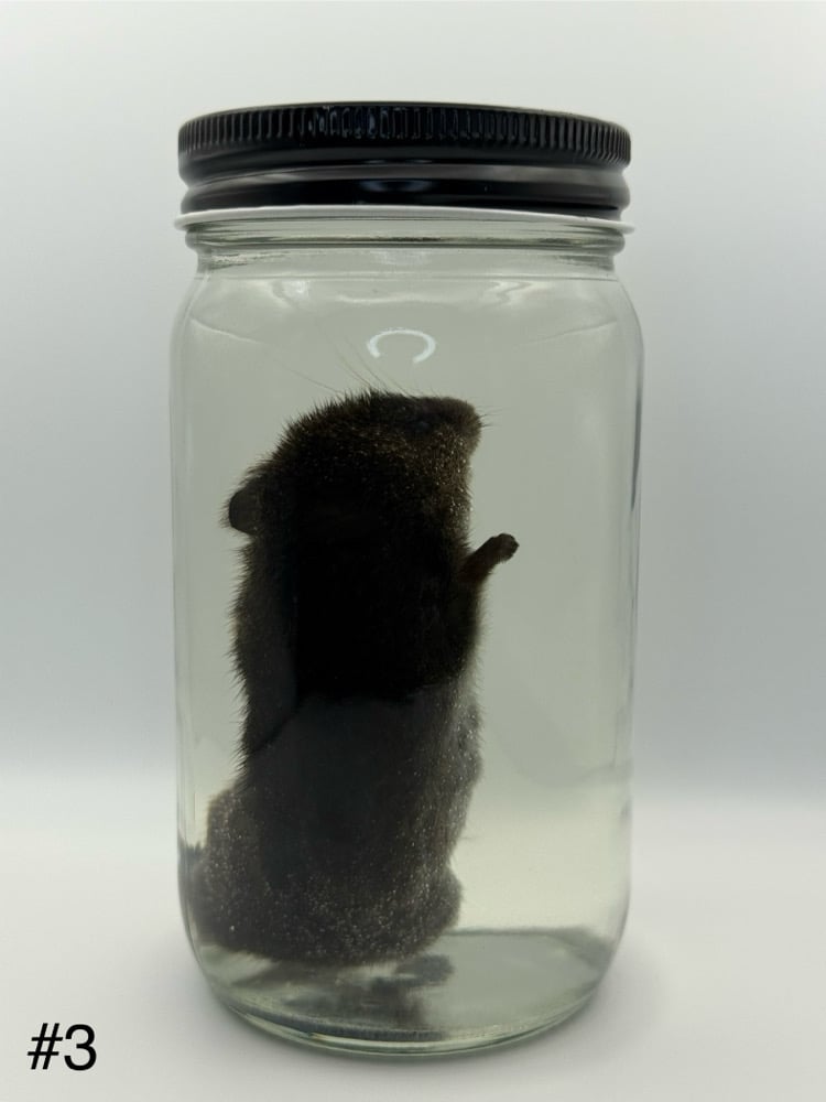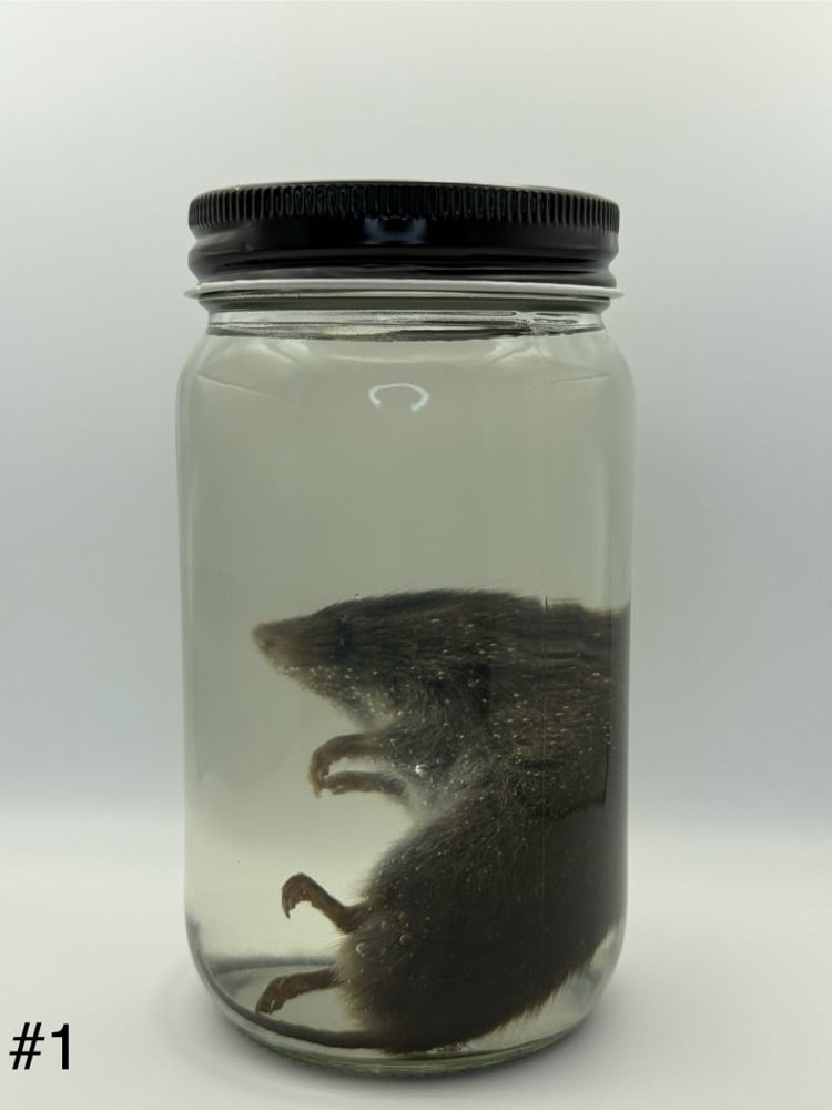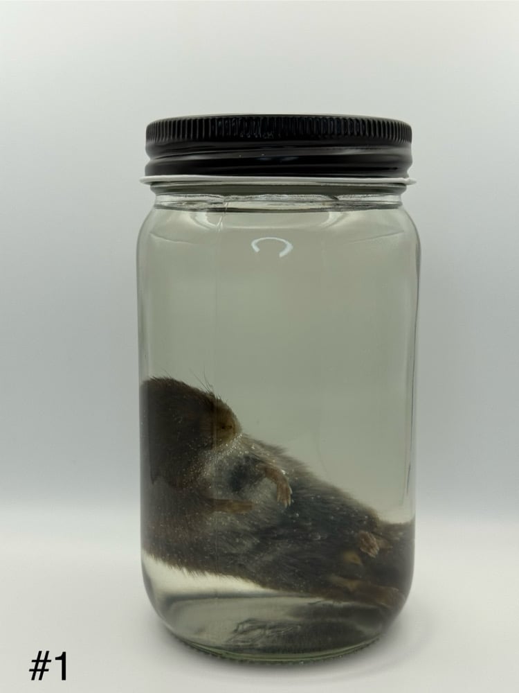 (1) Wet specimen containing: 1 vole (Microtus pennsylvanicus) in isopropyl alcohol. Stored in a glass jar with a metal screw-on lid.